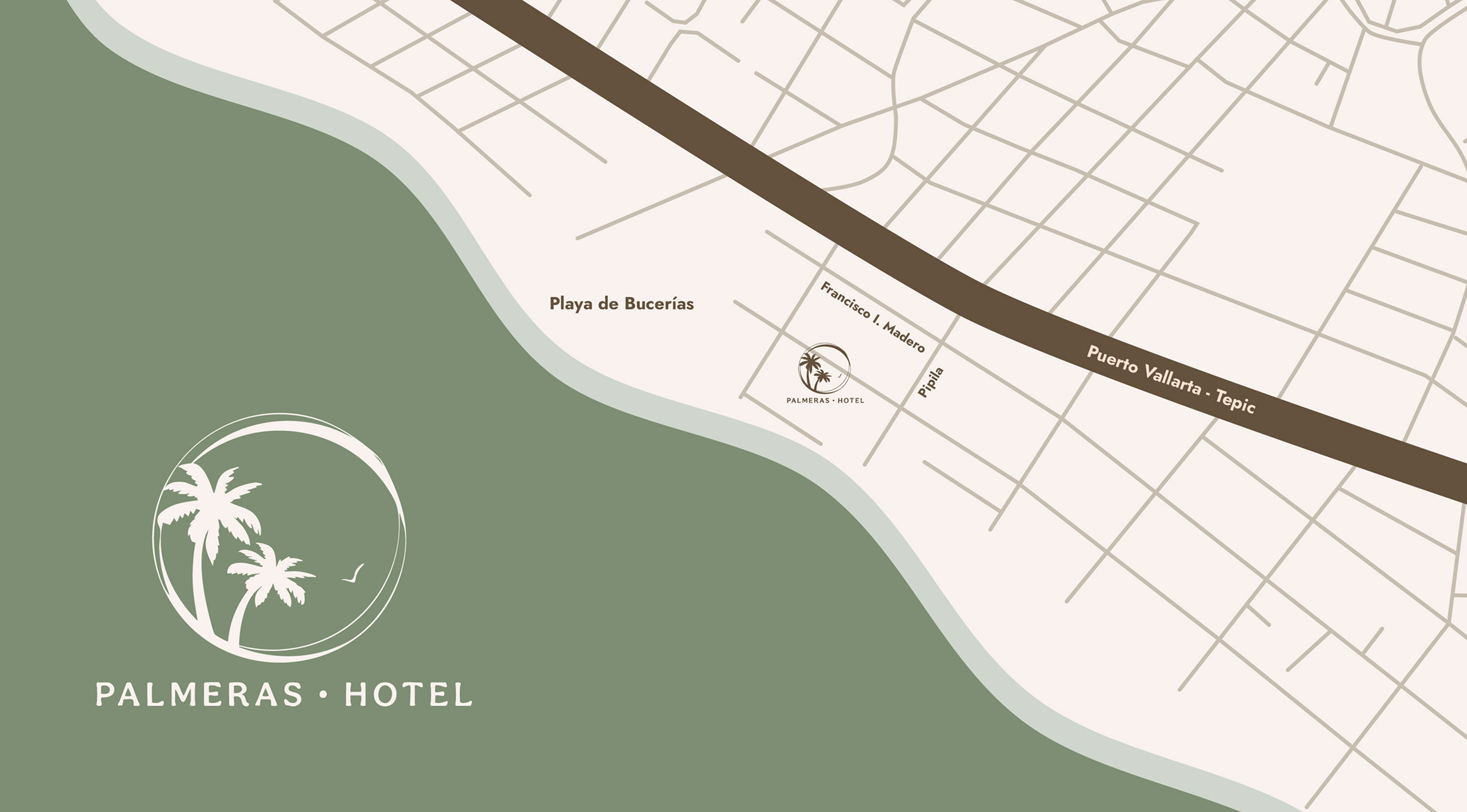 Hotel Palmeras es un refugio de paz y comodidad ubicado en el centro de Bucerías, a tan solo 100 metros del Océano Pacífico. Situado a 15 minutos del Aeropuerto Internacional de Puerto Vallarta y a 25 minutos del centro de Puerto Vallarta, nuestro hotel ofrece un acceso fácil a los mejores restaurantes, tiendas de artesanías, la iglesia principal, museos y la tranquilidad que buscas.